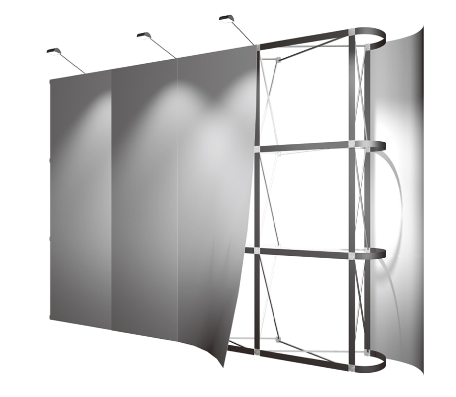 材 質: 鋁合金(直桿x21.前弧x8.包邊x4.膠板x6.磁條x1.燈具x4.拉桿箱x1) 產品特性: 最新技術的拉網式展屏,輕便的讓您難以置信集束成捆的網架,幾分鐘內彈起成一個大框架.既靈活又整潔,採用特製磁吸貼畫技術,配合專用投射燈,令您的展品陳列光彩奪目
