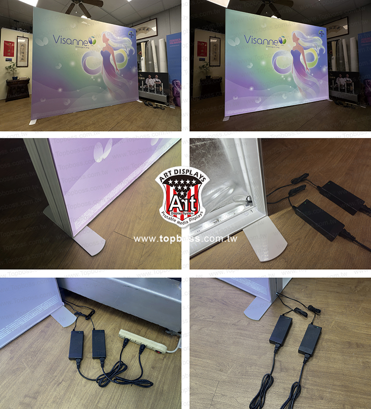 產品設計為携帶組合式燈箱,收納運送尺寸符合一般轎車即可運送,前置畫面為背打光無接縫阻燃燈布,後置為黑白遮光布易於攜帶,畫面摺疊展開後平整無摺痕,LED打光後讓您的廣告畫面光彩奪目~