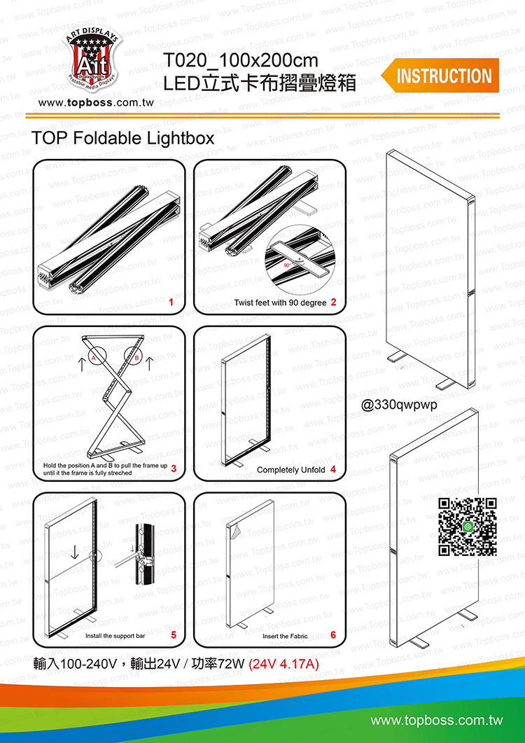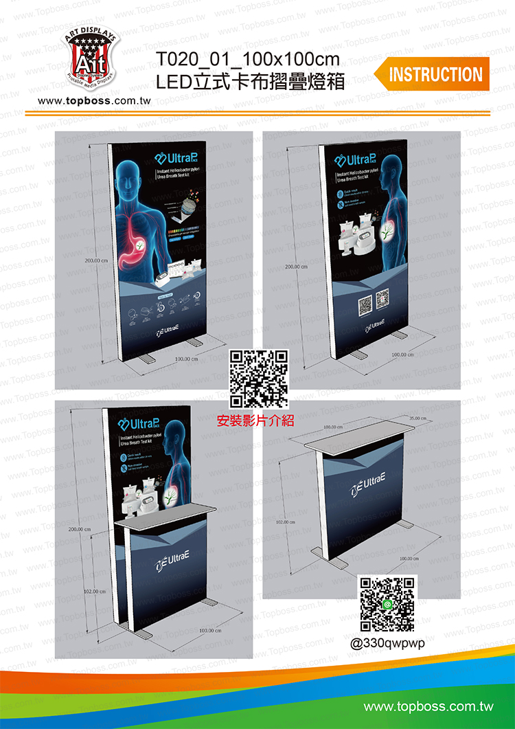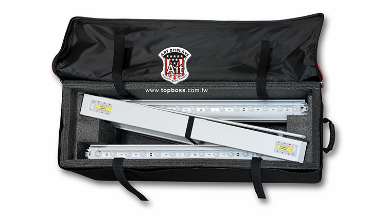 ※ 產品設計為携帶組合式燈箱,收納運送尺寸長度為140cm,鋁材重量約為22kg,一般轎車即可運送,前置畫面為背打光無接縫阻燃燈布,後置為黑白遮光布易於攜帶,畫面摺疊展開後平整無摺痕,LED打光後讓您的廣告畫面光彩奪目~
