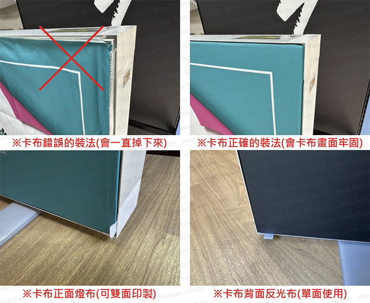 台普國際廣告資材網,在卡布燈箱產品結構上設計可攜帶組合,並且可以散件運輸長度尺寸控制在150cm,也可以到現場成品安裝,8至12cm卡布燈箱為常用規格。卡布燈箱畫面的安裝方法是,畫面四邊縫膠條,將縫完膠條的畫面卡進卡布型材的卡槽裡,這也是卡布燈箱名稱的由來~