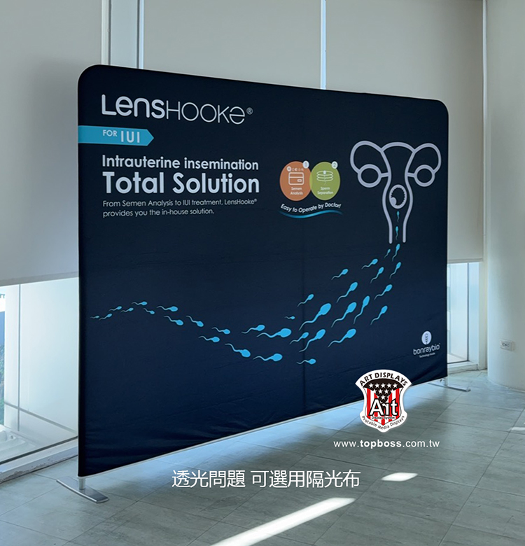 輕量且完全客製化的結構設計,高科技阻燃布,數位微噴設備(韓國D.gen)寬300公分無接縫,全國最大輸出尺寸,重複使用能取代木工裝潢的時間,節省拆除後的資源浪費,更能取代傳統制式鋁架拼接組合呆板的樣式!