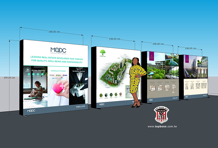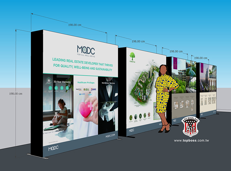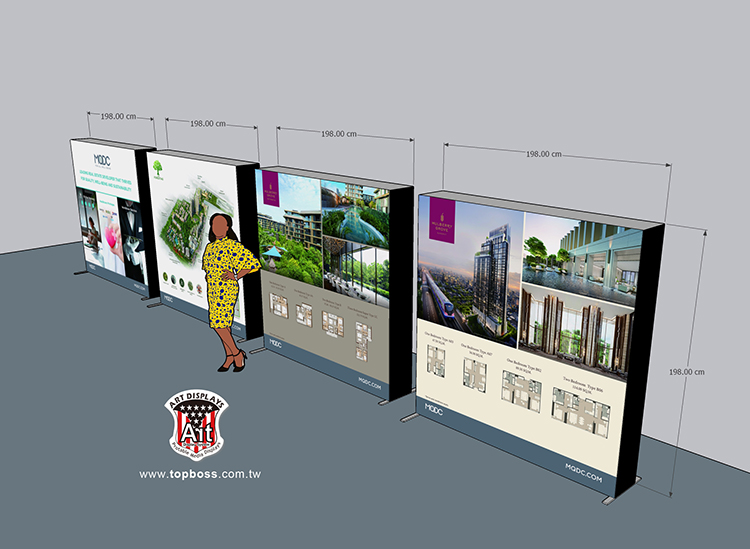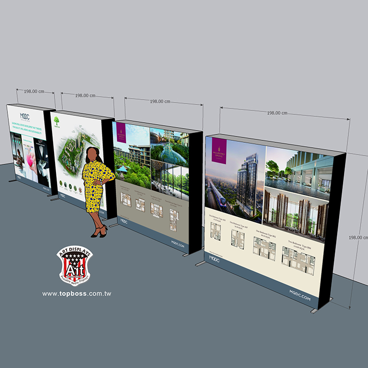 最新技術的拉網式卡布展屏 ,輕便的讓您難以置信集束成捆的網架 ,幾分鐘內彈起成一個大框架 ,既靈活又整潔,300cm高寬無接縫輸出 ,配合專用投射燈 ,令您的展品陳列光彩奪目 ,安裝簡易、無須任何工具;架身輕巧、易於攜帶;亦可自由組合及重覆使用,(若需現場安裝費用另計)。