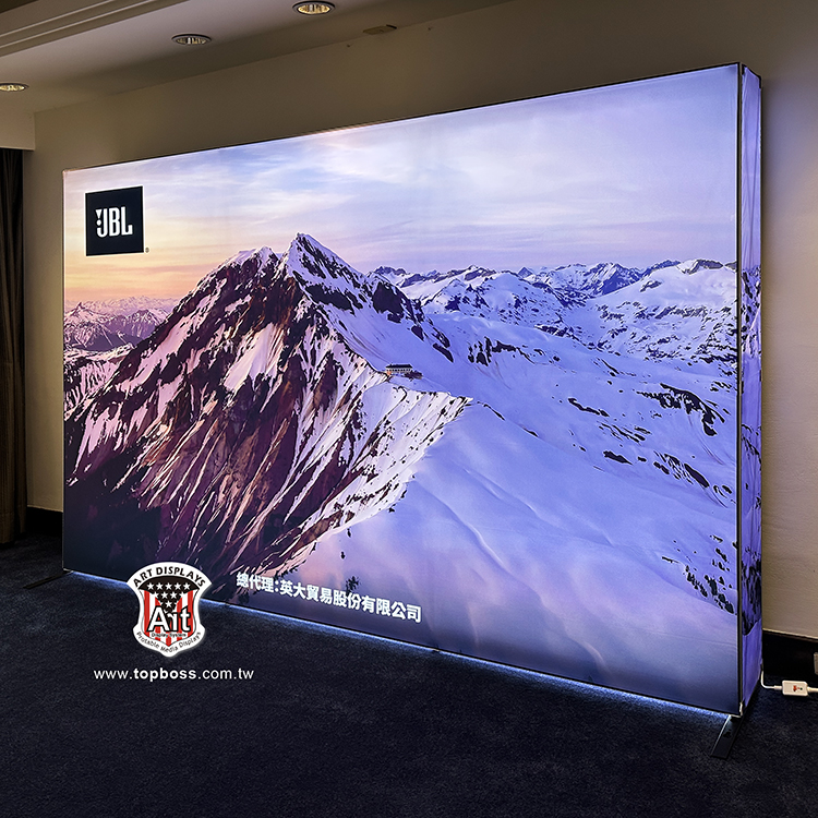 2023畫面升級後的重量僅剩十分之一 免工具即可組裝,畫面300cm高寬,完全可無接縫,不反光不皺褶是彈性布的產品特性,品牌展示牆兼具拍攝用背景超適合~