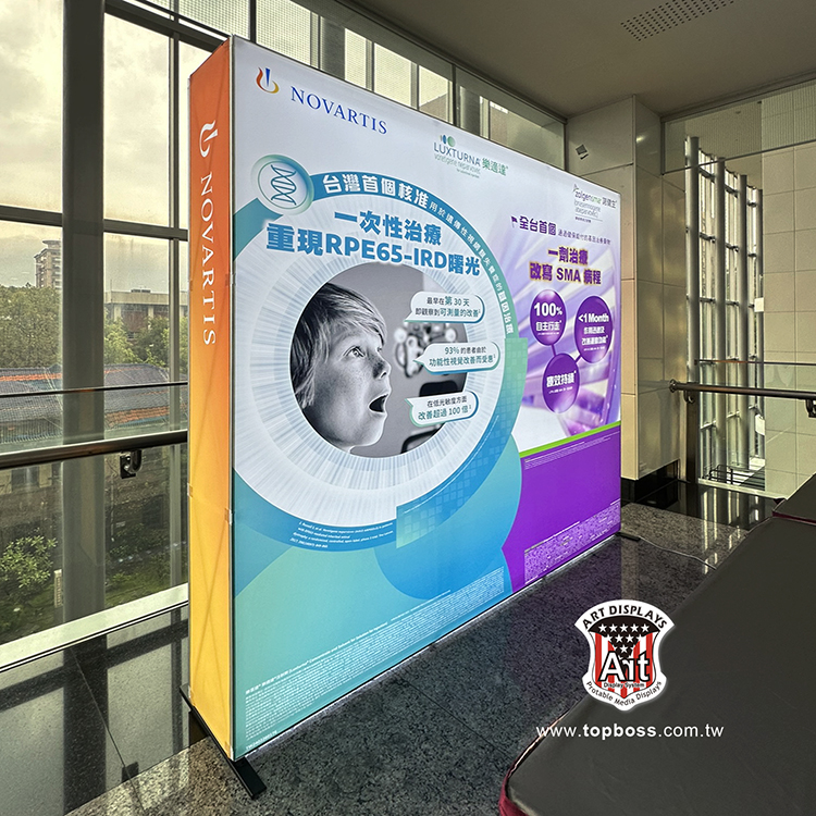 最新技術的拉網式卡布展屏 ,輕便的讓您難以置信集束成捆的網架 ,幾分鐘內彈起成一個大框架 ,既靈活又整潔,300cm高寬無接縫輸出 ,配合專用投射燈 ,令您的展品陳列光彩奪目 ,安裝簡易、無須任何工具;架身輕巧、易於攜帶;亦可自由組合及重覆使用,(若需現場安裝費用另計)。