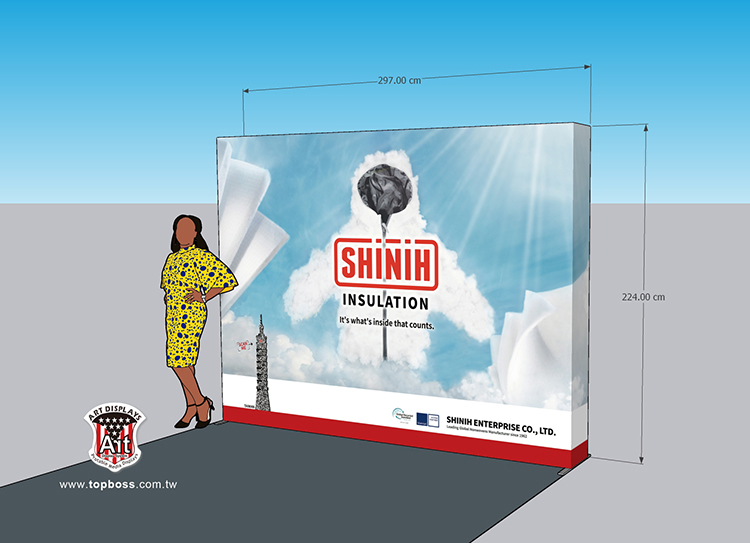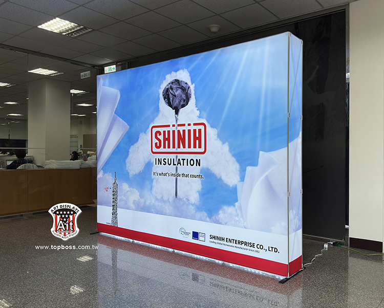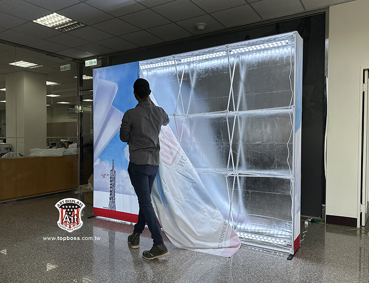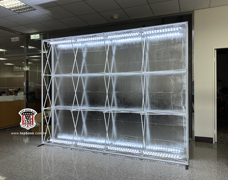 最新技術的拉網式卡布展屏 ,輕便的讓您難以置信集束成捆的網架 ,幾分鐘內彈起成一個大框架 ,既靈活又整潔,300cm高寬無接縫輸出 ,配合專用投射燈 ,令您的展品陳列光彩奪目 ,安裝簡易、無須任何工具;架身輕巧、易於攜帶;亦可自由組合及重覆使用,(若需現場安裝費用另計)。