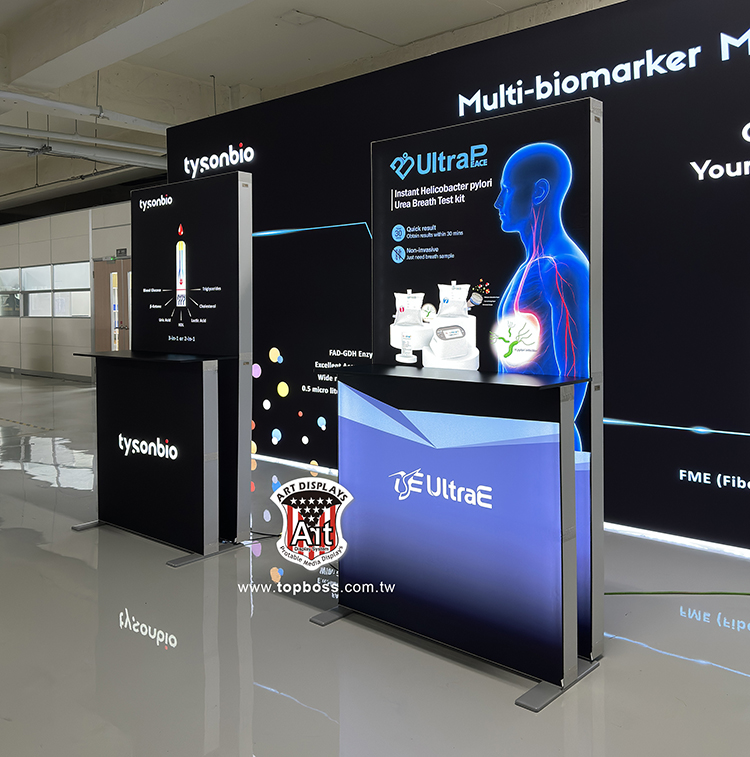 最新技術的拉網式卡布展屏 ,輕便的讓您難以置信集束成捆的網架 ,幾分鐘內彈起成一個大框架 ,既靈活又整潔,300cm高寬無接縫輸出 ,配合專用投射燈 ,令您的展品陳列光彩奪目 ,安裝簡易、無須任何工具;架身輕巧、易於攜帶;亦可自由組合及重覆使用,(若需現場安裝費用另計)。