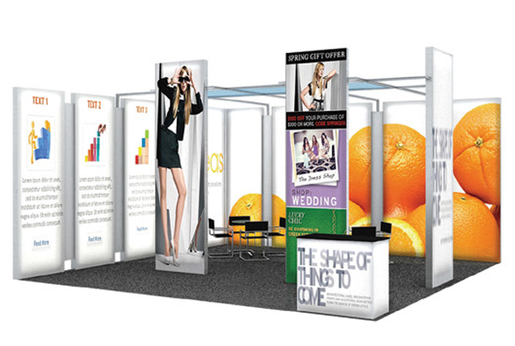 但是在展位的正面和背面可能會使用剛性面板。這個 Magic-window系統將定制模組化解決方案發展成一個可提供高達 30'x30“展位系統。Magic-window 解決方案非常適合國際大型展會,特殊活動裝飾和銷售點展示。