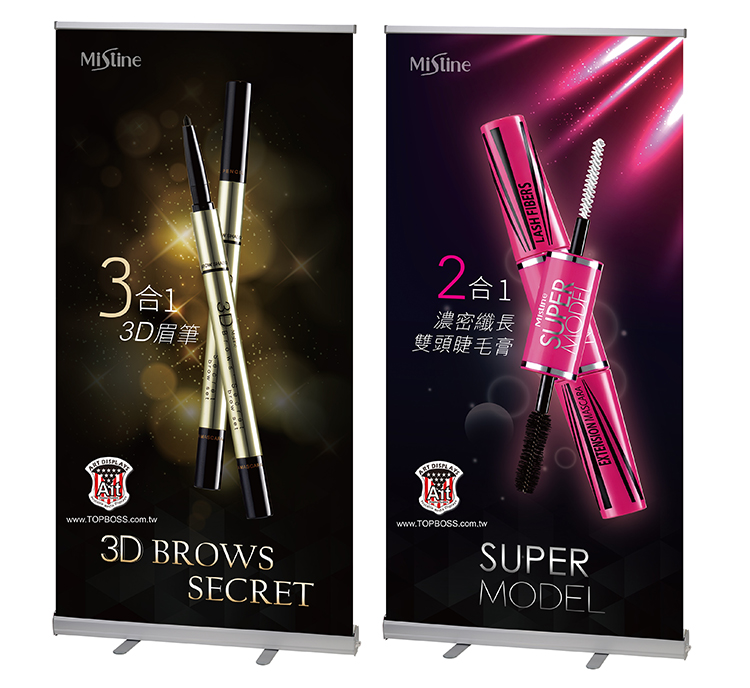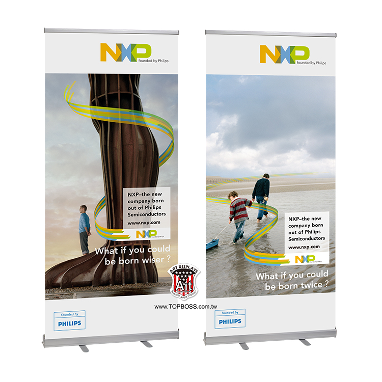 高科技鋁合金材質,桿身高度可伸縮式設計,簡易的組裝方式,海報自動收捲於展架主體內,即拉即用。可更換展示輸出品,展架重複使用成本低、效益高30秒立即展示,攜帶方便易於會場佈置、出國參展。展架桿身為可調式的伸縮桿,伸縮高度範圍90~200cm,可依照海報的高度做調整。
