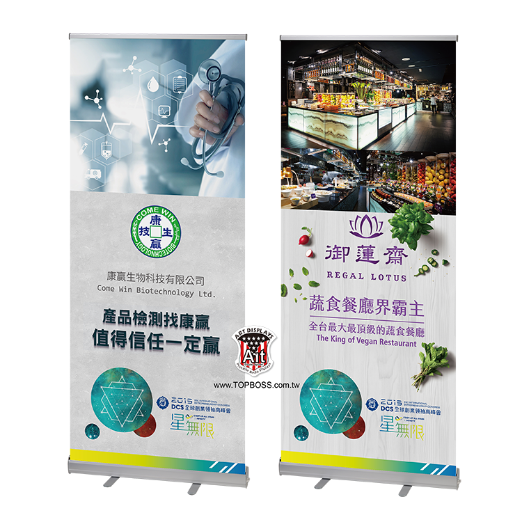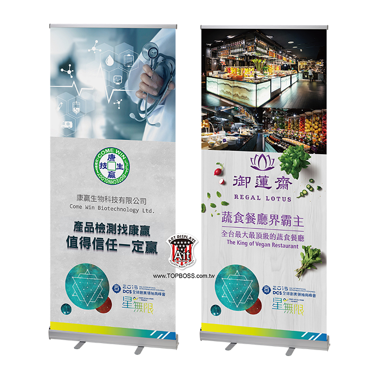 高科技鋁合金材質,桿身高度可伸縮式設計,簡易的組裝方式,海報自動收捲於展架主體內,即拉即用。可更換展示輸出品,展架重複使用成本低、效益高30秒立即展示,攜帶方便易於會場佈置、出國參展。展架桿身為可調式的伸縮桿,伸縮高度範圍90~200cm,可依照海報的高度做調整。