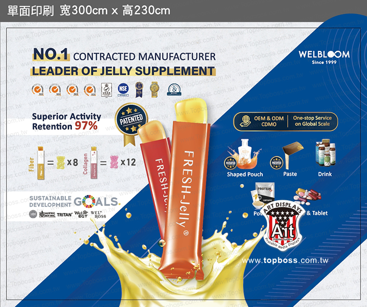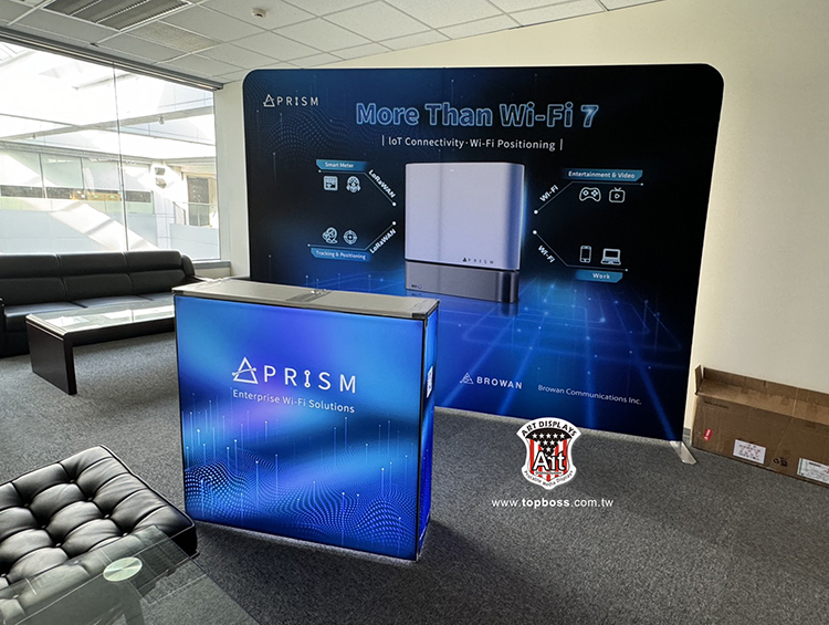 輕量且完全客製化的結構設計,高科技阻燃布,數位微噴設備(韓國D.gen)寬300公分無接縫,全國最大輸出尺寸,重複使用能取代木工裝潢的時間,節省拆除後的資源浪費,更能取代傳統制式鋁架拼接組合呆板的樣式!