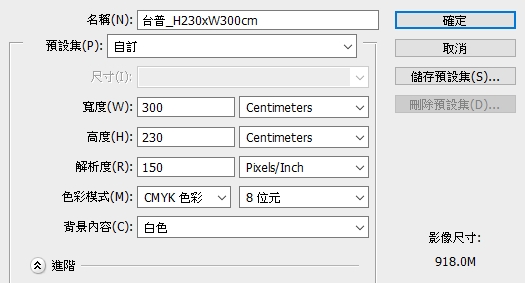 ※ 尺寸部分:與輸出的尺寸同樣大小(1:1)之檔案,例230x300cm (解析度150)918MB以上。